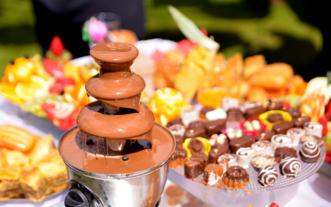 Az eredeti belga csokoládét folyató szökőkút színpompás friss trópusi gyümölcsoázis közepéből tör a magasba. Illatfelhője megtölti a teret, az olvadt csokiba mártogatott falatok pedig minden desszertélményt felülmúlnak. A 3 órás kitelepülés tartalmazza a korlátlan mennyiségben mártogatható gyümölcsöt, piskótát vagy pillecukrot, a belga ét-, tej- illetve fehér csokoládét, a logózott pálcikákat és a személyzetet. A szolgáltatás részeként egyedi virág és/vagy léggömb dekoráció is kérhető.
